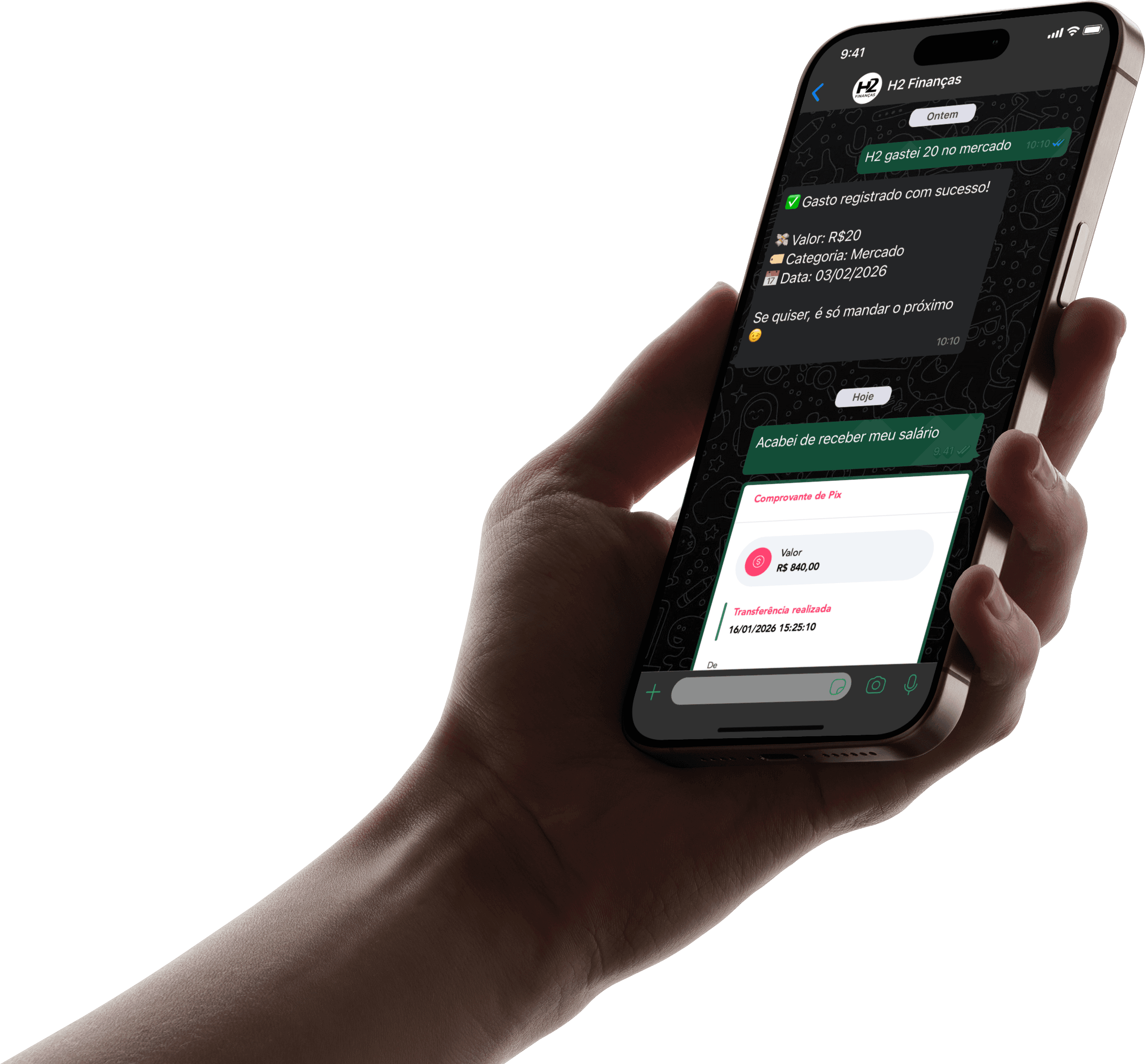 Envie uma mensagem para o H2 Finanças no WhatsApp com seus gastos ou receitas.